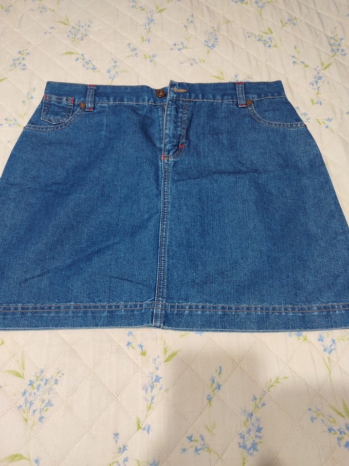 Düğmeli, bol kesim mavi denim midi etek, günlük kullanıma uygun rahat ve renkli bir stil sunar.