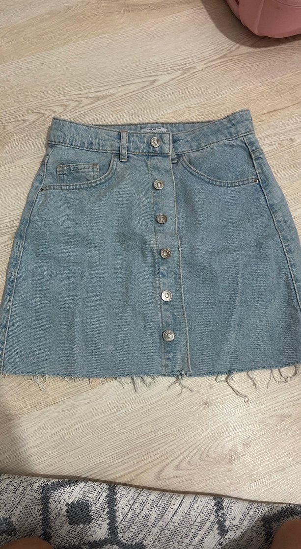Bu mavi denim midi etek, düğmeli ön kısmı ve bol kesimiyle rahat bir sokak stili sunar. Normal boyda, hafif tırtıklı etek ucu vardır, günlük kullanım için uygundur.