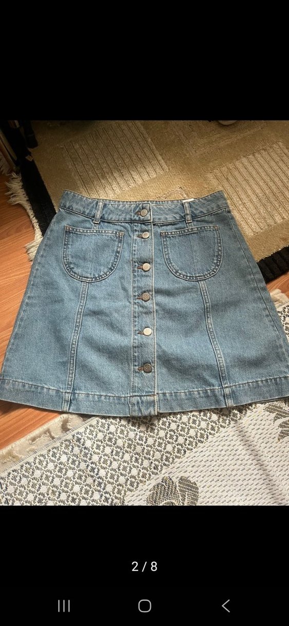 Pastel mavi renkli, düğmeli ve bol kesim midi denim etek, bohem tarzıyla günlük kullanıma uygundur. mudo s beden hiç giyilmedi