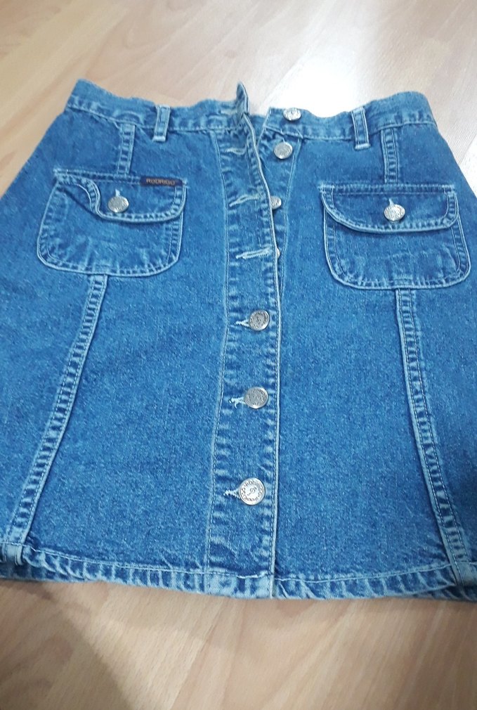 Önden düğmeli, cep detaylı mavi fitilli denim midi etek. Parlak yüzeyiyle günlük sokak stiline uygundur.