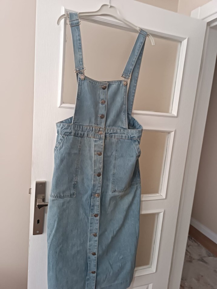 Düğmeli ön cep detaylı, askılı ve bol kesim mavi denim midi salopet, günlük kullanıma uygun bohem tarzda.hiçbir sorunu yok 2 3 kez giyindi