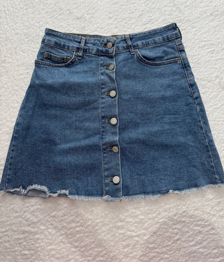 Önden düğmeli, bol kesim mavi denim mini etek. rahat ve günlük kullanıma uygun. #etek #kot #addax