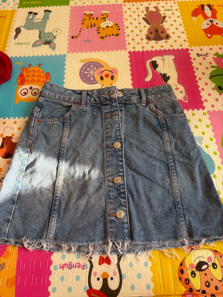 Önü düğmeli, salaş kesim mavi denim mini etek, yıpranmış etek ucu ile rahat ve retro bir görünüm sunar. Bohem tarz için ideal. Hiç giyilmedi