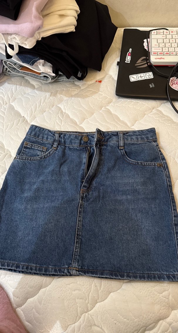 Düğmeli ön kısmı ve bol kesimiyle mavi denim mini etek, günlük sokak stili için uygun. Normal midi boyda ve desensizdir.