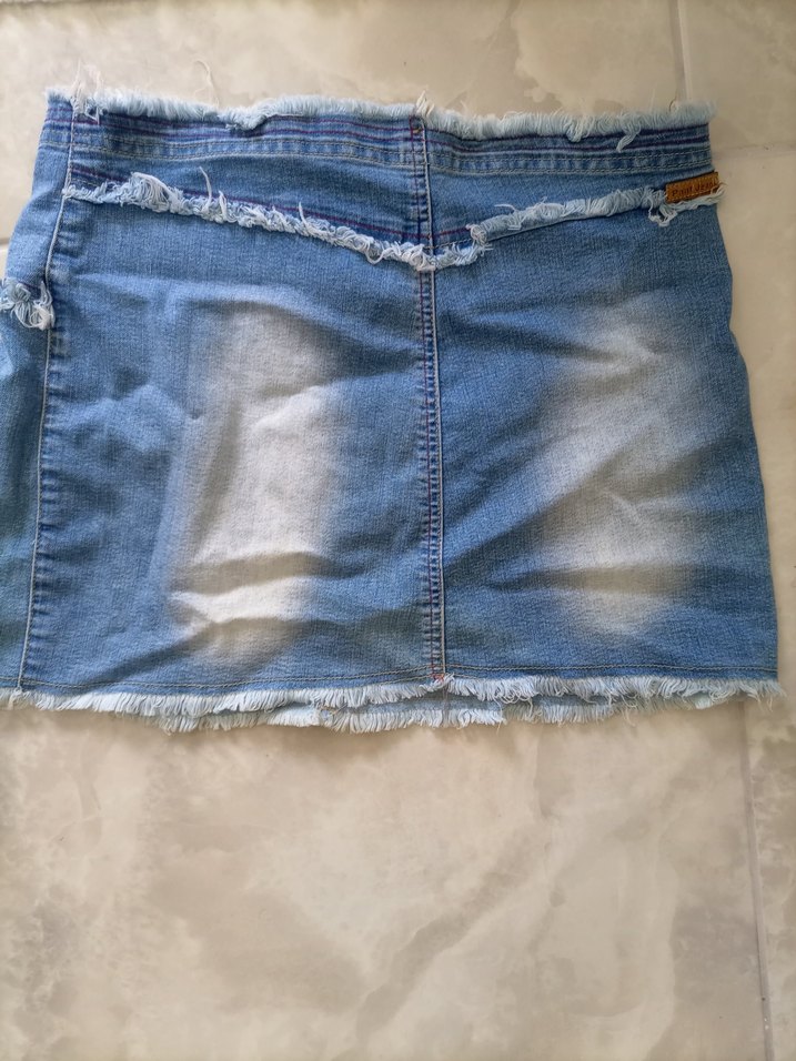 Düğmeli ve yıpranmış kenar detaylı, fitted kesim mavi denim mini etek. Gri soluklama efektli, günlük sokak stili için uygun.