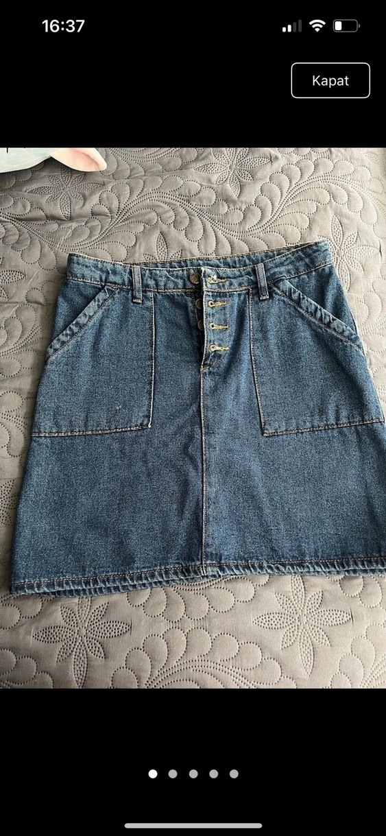 Ön düğmeli ve cepli, bol kesim mavi denim mini etek. Normal boyda ve sade tasarımlı, günlük rahat kullanım için uygun.