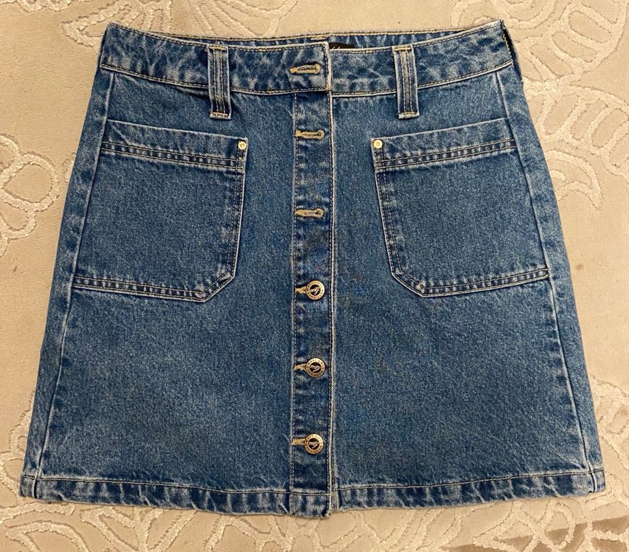 Düğmeli ve cepli, parlak mavi renkli, dar kesim denim mini etek. ✨