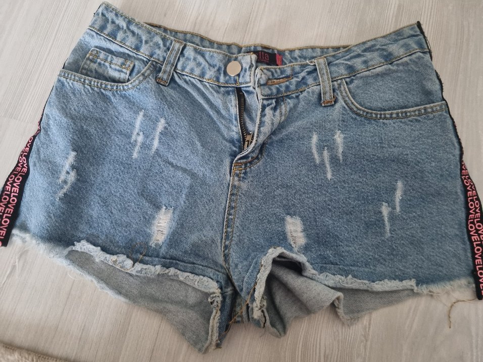Düğmeli, bol kesim mavi denim mini şort, hafif yıpranmış detaylarla günlük sokak stili için uygundur.