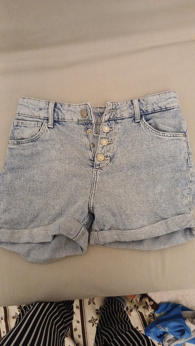 Düğmeli ön kapamalı, bol kesim mavi denim mini şort. Günlük kullanım ve sokak tarzı için uygun, pastel tonlarda kısa paça şort.