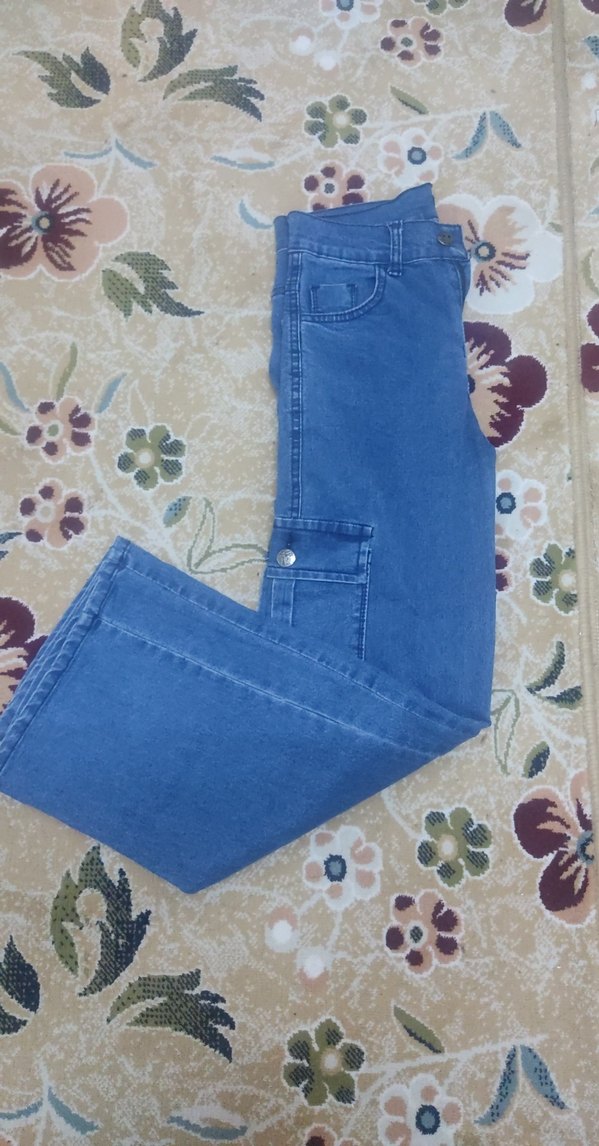 Salaş kesim, düğmeli mavi denim pantolon. Pastel tonlarda tie-dye deseniyle günlük ve sokak stiline uygun midi boyda.
