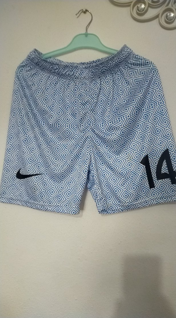 Düğmeli, baskılı desene sahip mavi mini erkek mayo. Athleisure ve streetwear tarzına uygun, günlük kullanıma ideal.