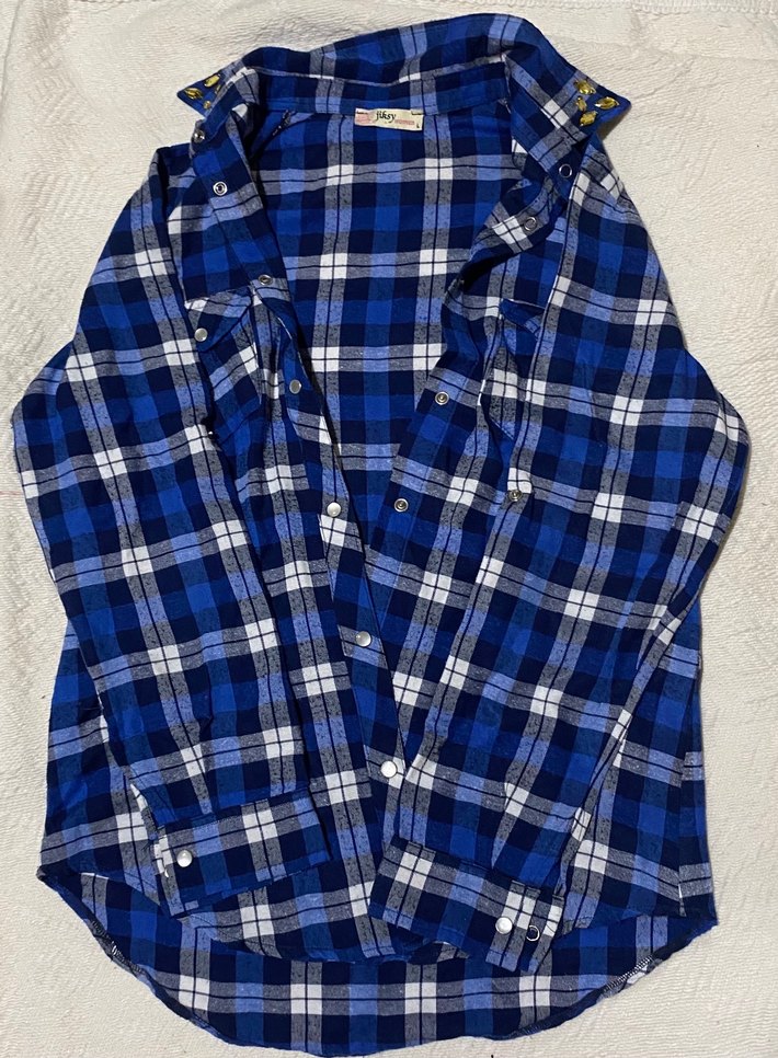 Düğmeli, uzun kollu, yakalı, bol kesim mavi ekose desenli kadın gömlek. Normal boyda, günlük rahat kullanıma uygun tekstil kumaş. Beden: L • Kalıp: Oversize • Renk: Mavi – beyaz ekose • Kullanım: Gömlek / ceket • Durum: Temiz, sorunsuz