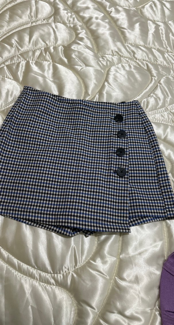 Koyu mavi ekose desenli kız eteği, düğmeli ve bol kesimdir. Pamuklu yumuşak kumaştan üretilmiştir. Sokak stili için uygundur.