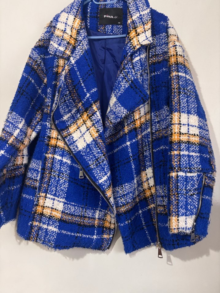 Mavi ekose desenli, düğmeli ve uzun kollu kadın ceket. Notlu yaka ve bol kesimiyle günlük rahat kullanıma uygundur.