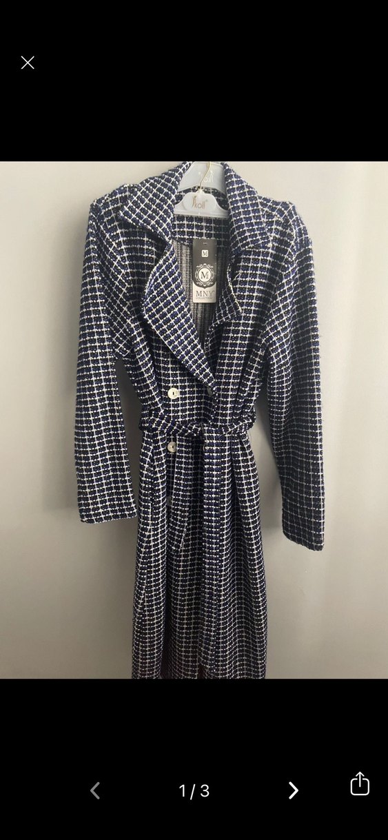 Düğmeli Mavi Ekose Uzun Kadın trenç