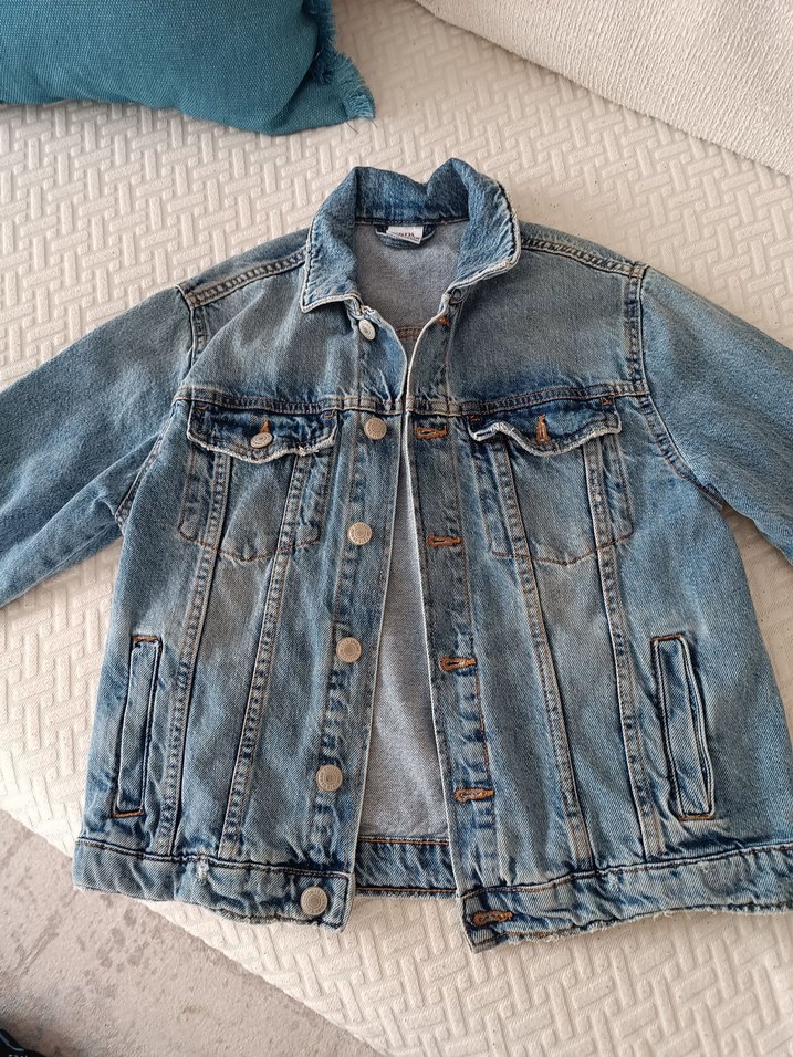 Mavi denim ceket düğmeli ön, uzun kollu ve kesik yakalıdır. Bol kesim, günlük kullanıma uygun rahat stil.