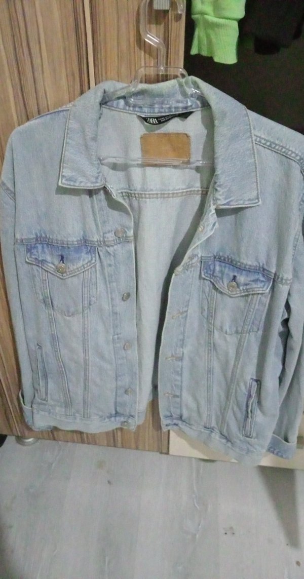Düğmeli, yakalı ve uzun kollu mavi denim ceket. Gevşek kesimiyle günlük rahat stil için uygundur.