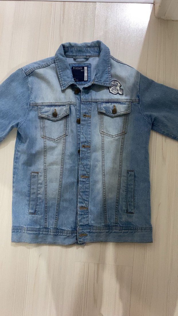 Düğmeli ön kapama, kesik yakalı ve uzun kollu mavi kadın denim ceket. Rahat kesim ve parlak mavi renkte, günlük sokak stili için uygun.