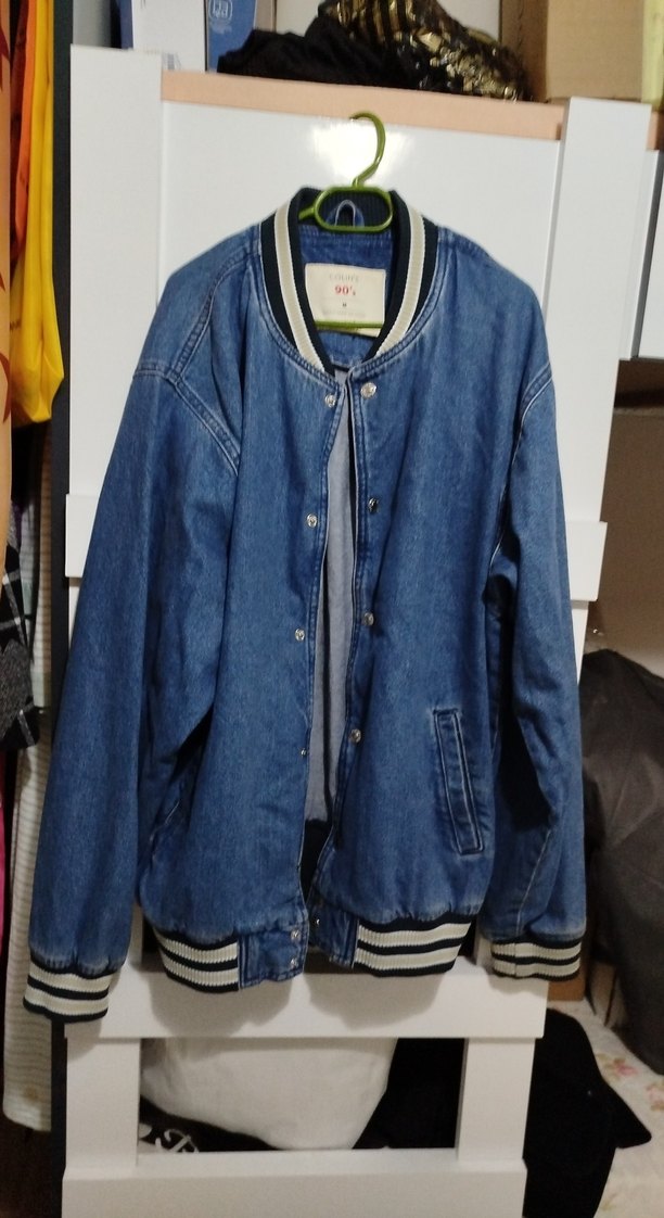 Mavi renkli, düğmeli, uzun kollu, bol kesim erkek denim ceket. Bisiklet yaka ve çizgili ribanalı manşetlere sahip, günlük rahat stil için uygun.