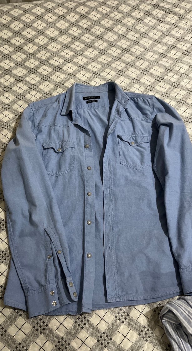 Düğmeli, uzun kollu mavi denim erkek gömlek, notched lapel yakaya ve cep detaylarına sahiptir. Rahat kesimiyle günlük sokak modasına uygundur.