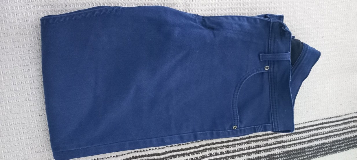 Düğmeli, mavi renkli, fitted kesim erkek denim pantolon. Midi boyda ve parlak yüzeylidir, günlük rahat kullanıma uygundur.