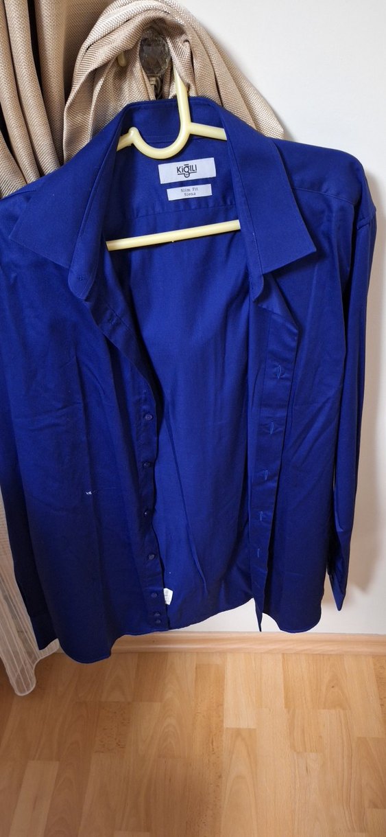 Düğmeli, mavi erkek gömlek. Notch yaka, uzun kollu ve regular fit. İpek gibi parlak kumaştan, ofis ve sokak stiline uygun.