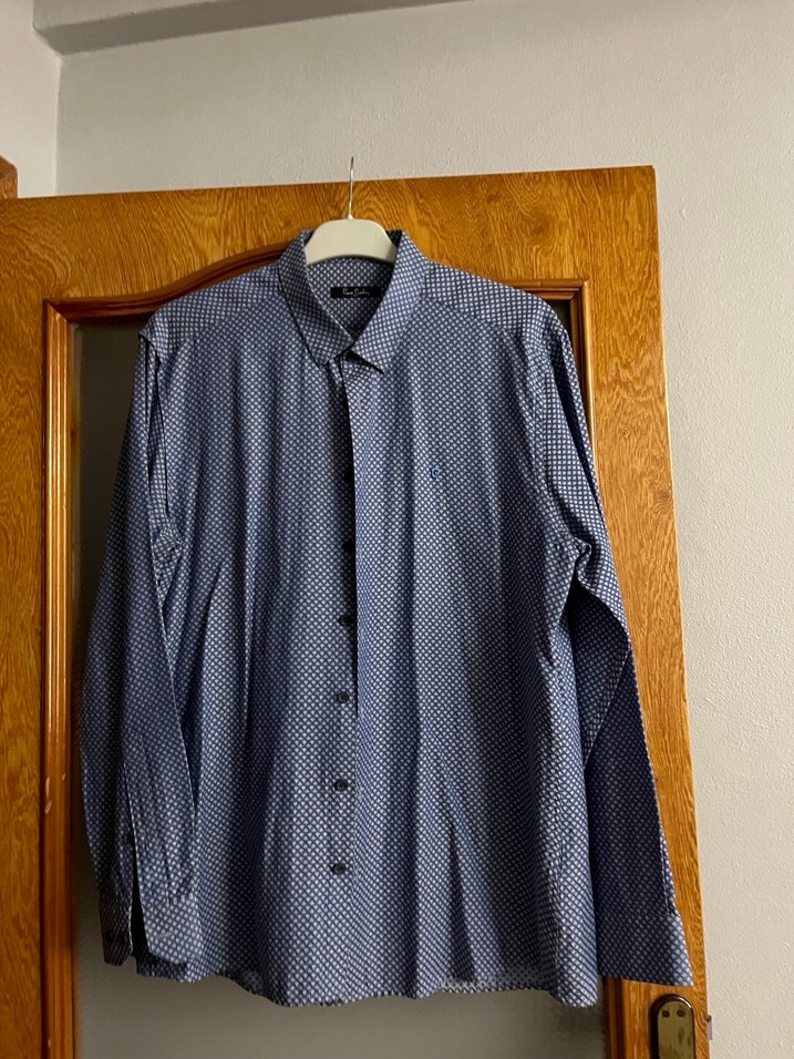 Düğmeli, notalı yakalı ve uzun kollu erkek gömleği. Regular fit, normal boy ve sentetik kumaştan, mavi renkte, iş ortamı için uygundur.