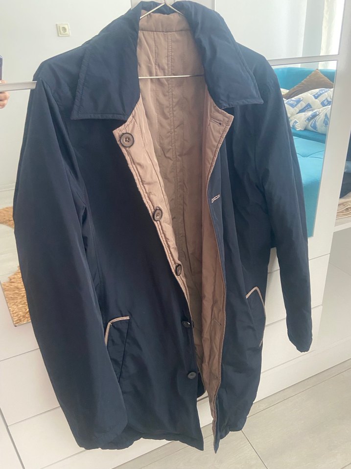 Düğmeli ve normal boy midi ceket, mavi renkte, uzun kollu ve regular fit. Sentetik kumaştan üretilmiş, iş ve günlük sokak tarzına uygun.