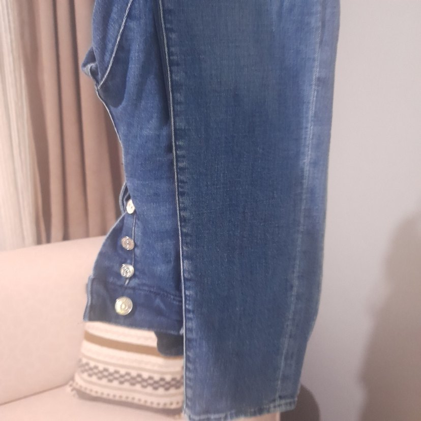 Düğmeli detaylara sahip, midi boy ve regular fit mavi kadın kot pantolon, gündelik kullanıma uygundur.