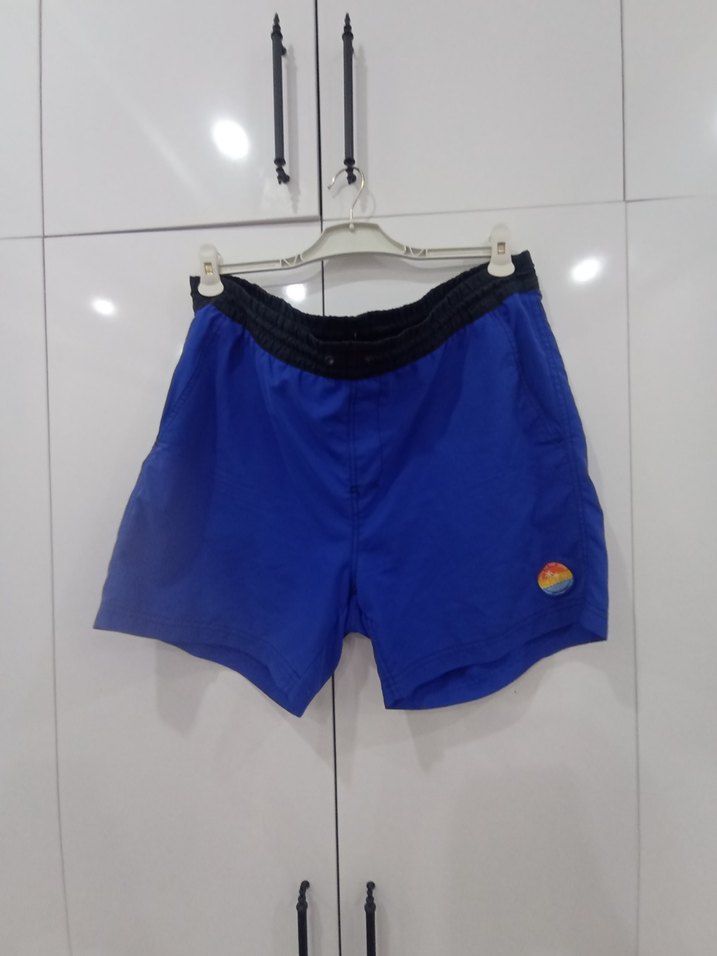 Renkli batik desenli, düğmeli, bol kesim mavi erkek yüzme şortu. Retro bohem tarzıyla plajda kullanıma uygun.
