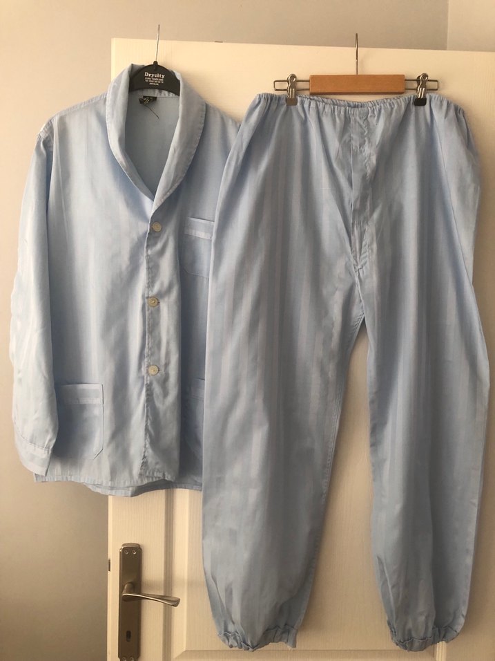 Yumuşak mavi kumaştan, düğmeli, yakalı ve uzun kollu, bol kesim erkek pijama takımı. Alt pantolon lastikli manşetlidir. ️