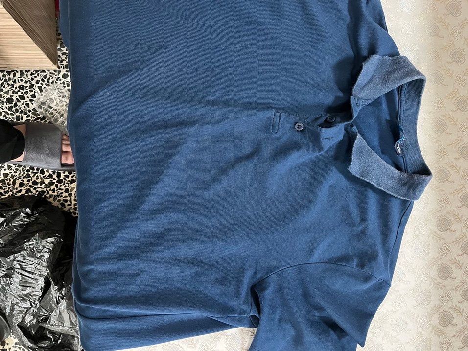 Düğmeli ön kısmı ve yakalı kesimiyle mavi erkek polo tişört. Kısa kollu, vücuda oturan ve normal boyda, sentetik kumaştan üretilmiştir.