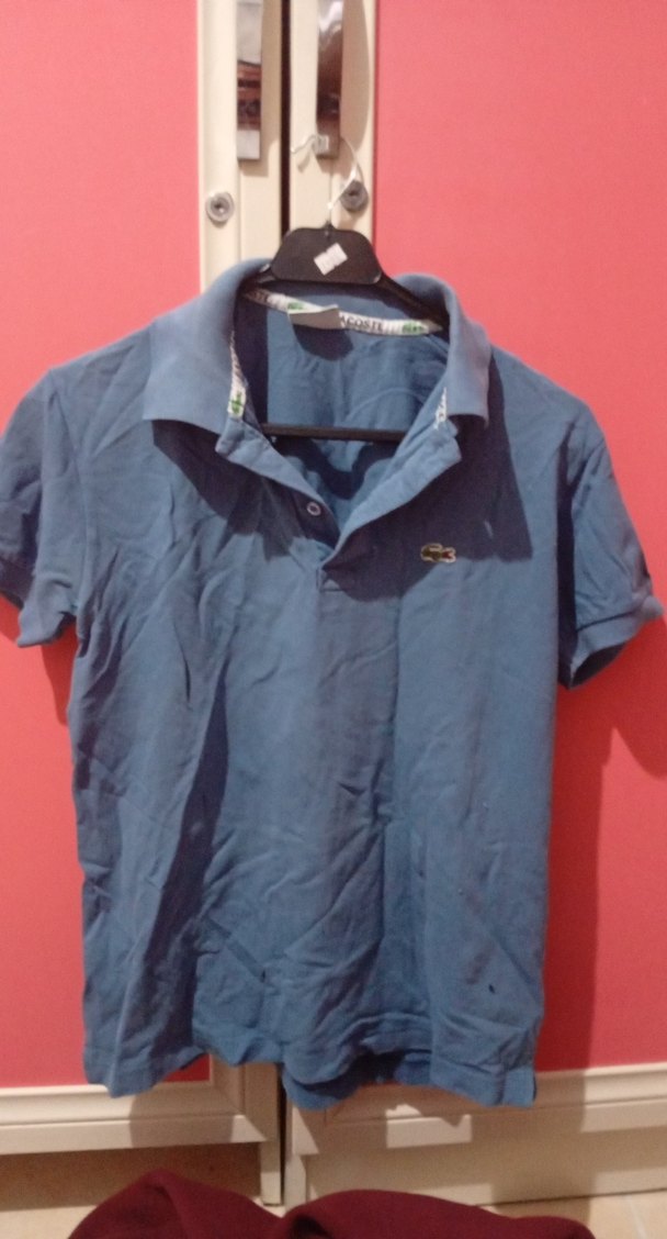 Düğmeli yakalı, kısa kollu, mavi-gri tonlarında, sentetik yumuşak kumaştan yapılmış, dar kesim erkek polo tişört.