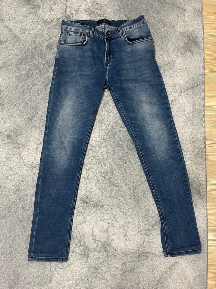 Düğmeli, regular fit mavi denim erkek jean, hafif batik desenli, günlük rahat kullanım için uygun.