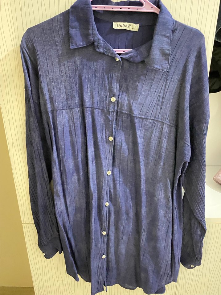 Mavi ve gri tonlarda batik desenli, keten kumaştan yapılmış, düğmeli, uzun kollu, yakalı ve bol kesim kadın gömleği. Hiç giyilmedi 40 beden