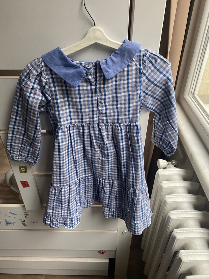 Uzun kollu, düğmeli ve gömlek yaka kız elbisesi. Yumuşak keten kumaştan yapılmış, mavi ve gri kareli desene sahip. Sadede 1 kez giyildi