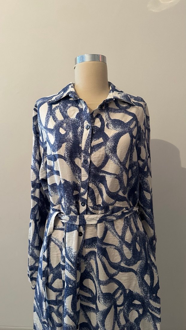 Düğmeli, yakalı ve uzun kollu bu uzun elbise, bol kesim ve mavi-gri batik desenlidir. Sentetik kumaştan olup bel bağlaması bulunur. Elbise 7 numara. Büyük beden