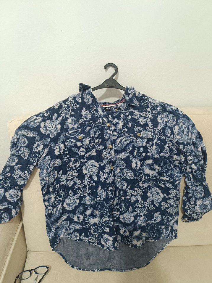 Düğmeli, yakalı, uzun kollu mavi ve gri batik desenli denim gömlek. Salaş kesimli, bohem tarzda, günlük kullanıma uygun.