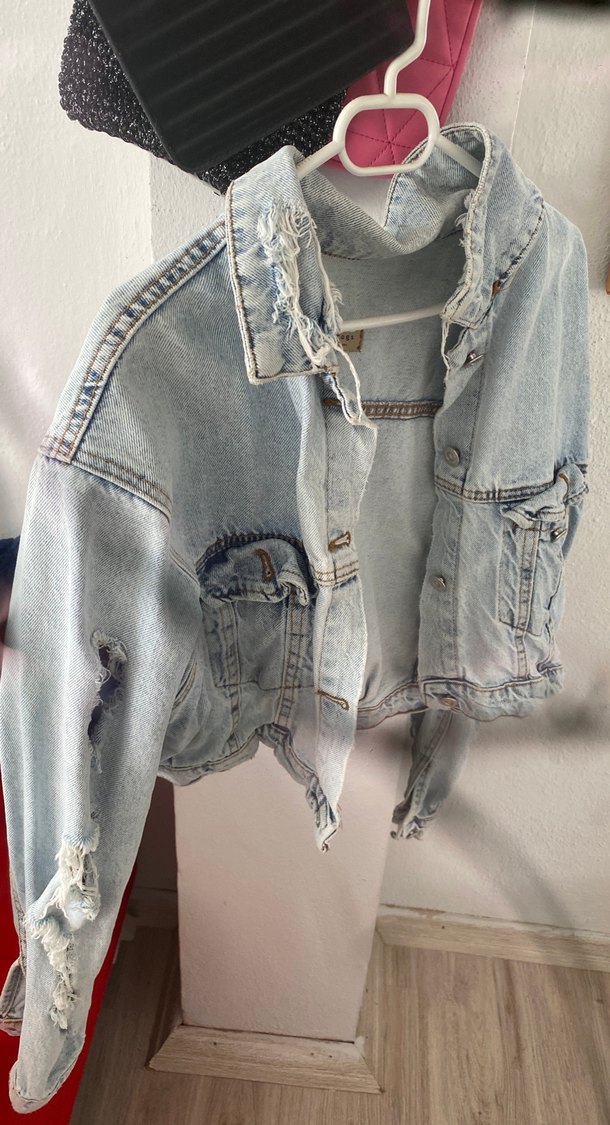 Gevşek kesim, düğmeli ve yakalı bu mavi-gri denim ceket, yıpranmış detaylarıyla günlük sokak stili için uygundur. Askılı kolları ve midi boyu vardır.