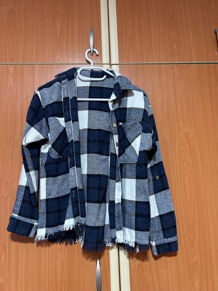 Düğmeli, uzun kollu, mavi ve gri kareli pamuklu kumaştan, notched yaka detaylı, midi uzunlukta bol kesim kadın gömlek. Rahat ve günlük kullanıma uygun.