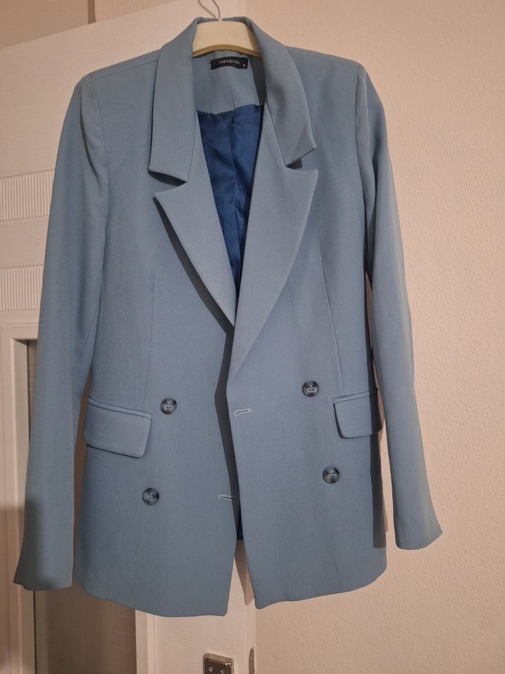 Mavi-gri renkli midi blazer, kesimli yaka, düğmeli ön ve uzun kolludur. Sentetik kumaştan üretilmiş, ofis için uygundur.