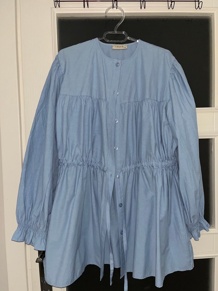 Yumuşak keten kumaştan yapılmış, düğmeli ön kısmı, uzun kolları ve yüksek yakası olan rahat kesim mavi hamile bluzu. Günlük kullanım için midi boyda.