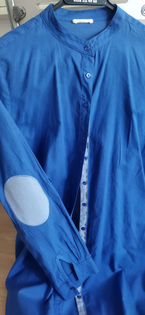 Pamuk kumaştan yapılmış, düğmeli ve dirsek yamalı, notched lapel yakalı, bol kesim mavi hamile gömleği. Normal midi uzunluğunda, günlük kullanıma uygun.