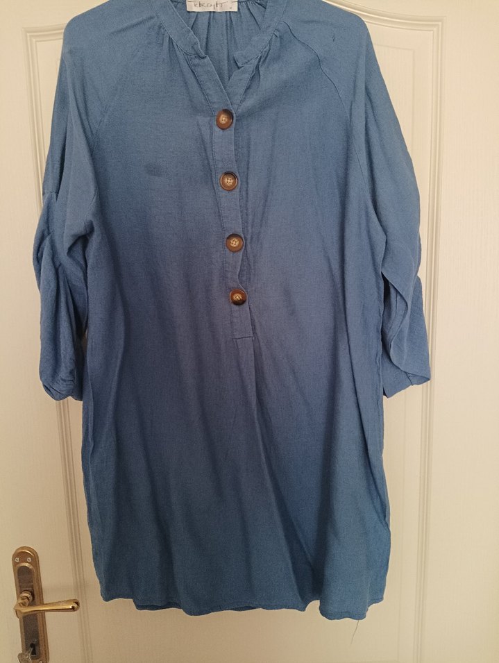 Mavi renkli, keten kumaştan yapılmış, düğmeli, uzun kollu ve V yakalı hamile tunik. Rahat ve salaş kesim, midi boyda günlük kullanım için uygundur. 38- 40 bedene uygun