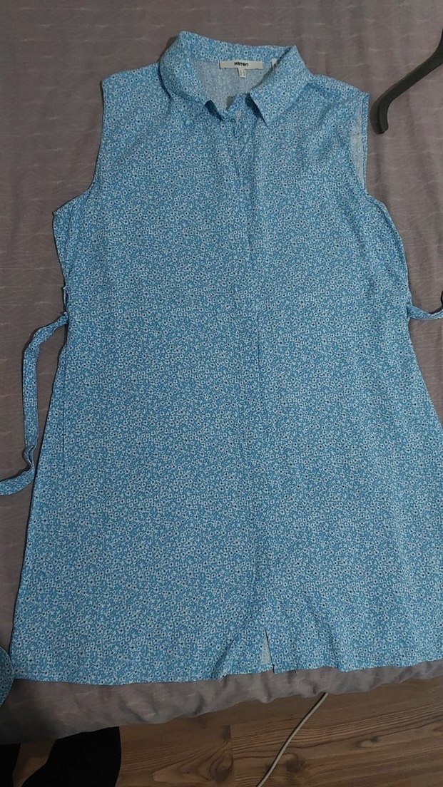 Mavi, düğmeli, kolsuz hamile tunik. Yumuşak sentetik kumaştan, bol kesim ve midi boyda, günlük kullanım için uygundur.