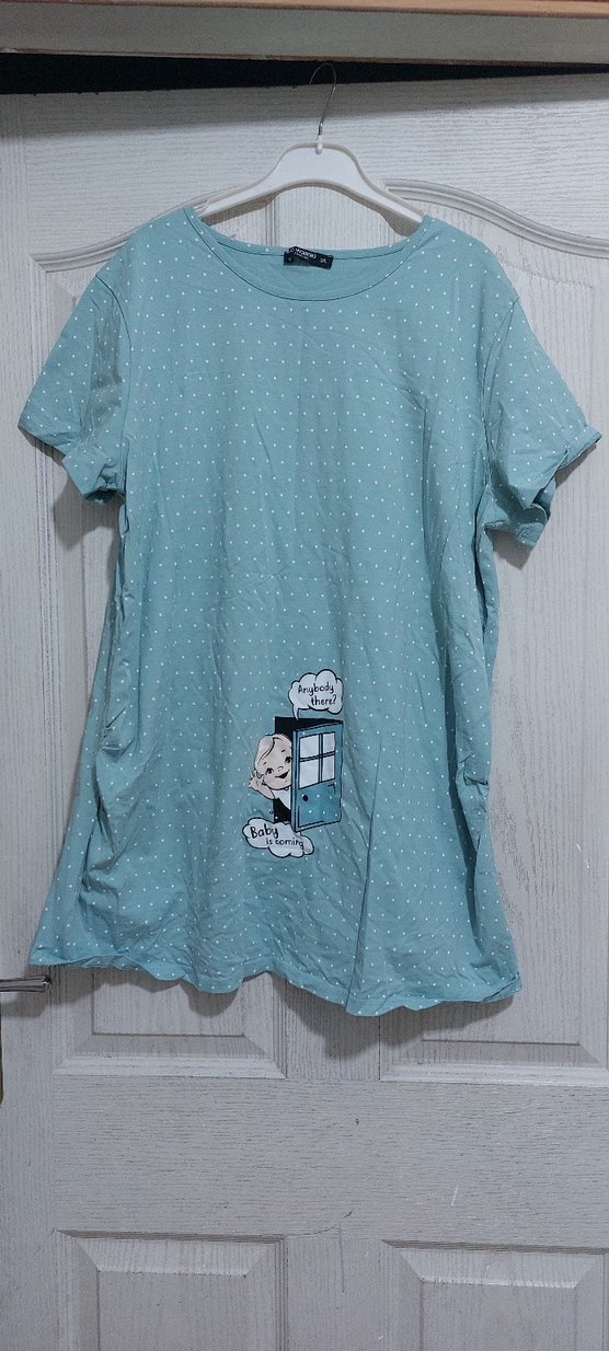 Pamuklu, düğmeli, pastel mavi renkte, kısa kollu ve baskılı bol kesim hamile tişörtü. Günlük rahat sokak stili için uygundur.