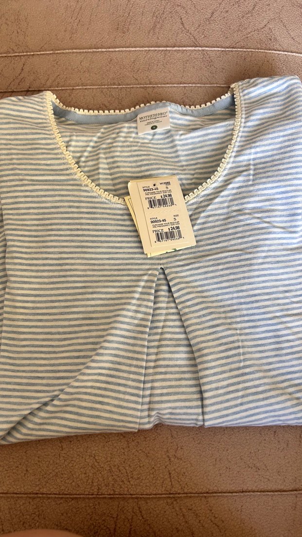 Pamuk kumaştan, düğmeli detaylı, kısa kollu, yuvarlak yakalı mavi hamile tişörtü. Rahat kesimi ve baskılı deseniyle günlük kullanıma uygundur.