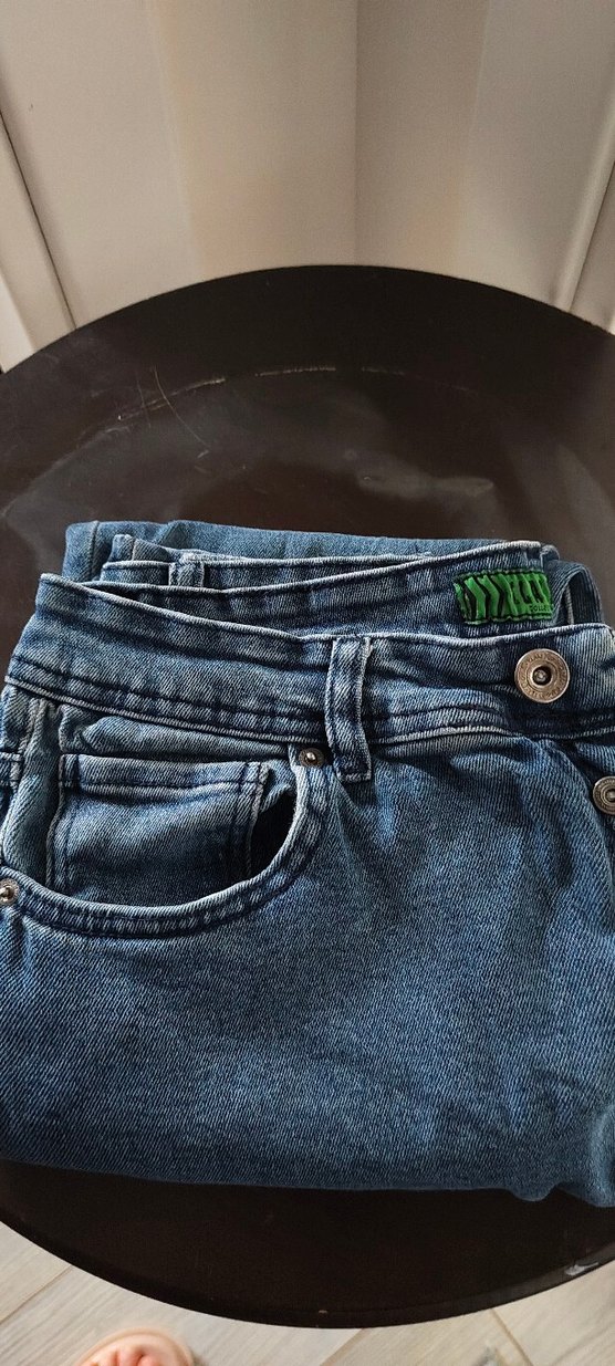Düğmeli, mavi denim jean, kısa mini boy ve regular fit kesimle günlük sokak stiline uygun, desensiz tasarım. bel 42 boy 94 basen 50 cm likralıdır ağ kısmında renk solması mevcut