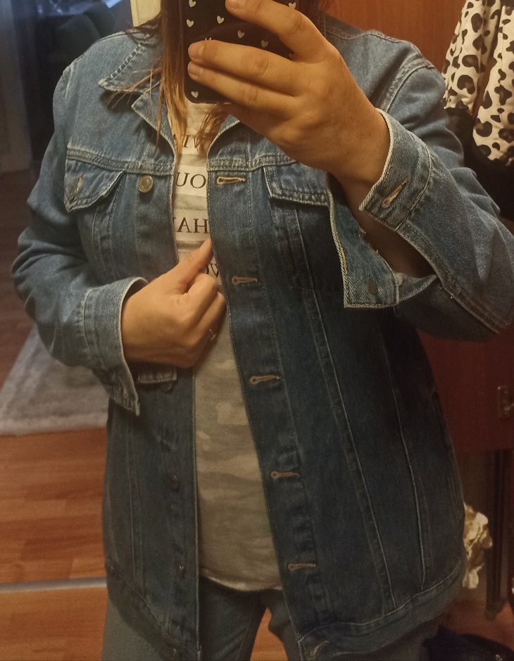 Bu mavi denim ceket, düğmeli ön kısmı, uzun kolları ve kesimli yaka detayıyla dikkat çeker. Rahat kesimi ve günlük sokak stili ile uygundur. M beden yepyeni