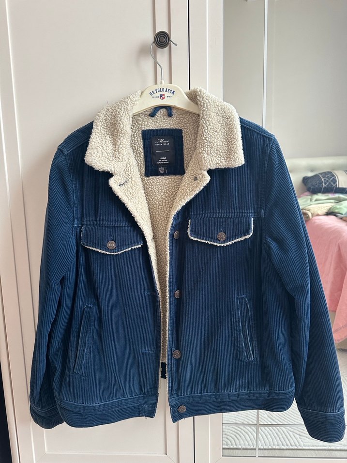 Mavi kadife kumaştan, düğmeli, yakası peluş detaylı, bol kesim ve uzun kollu rahat sokak stili ceket.